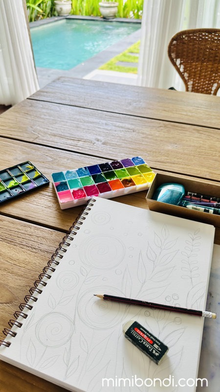 - A quiet sketching moment in Bali — surrounded by light, colour, and a pool that makes everything glow